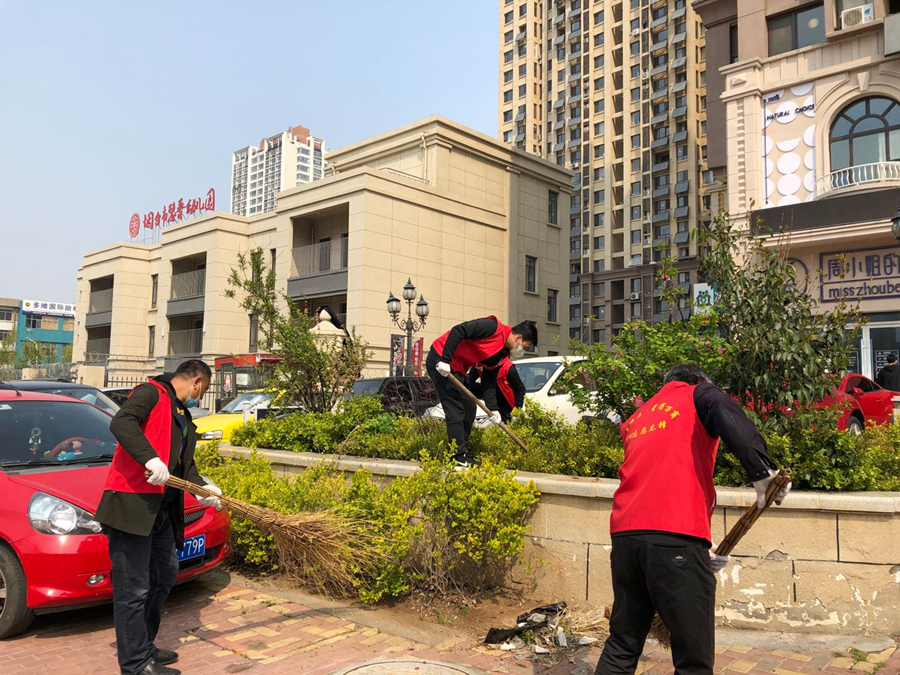 在活动现场,“山东出版实业烟台分公司党员志愿服务队”旗帜飘扬。队员们分工协作,铲除、捡拾、清扫、装运,对社区各处卫生死角进行彻底打扫。