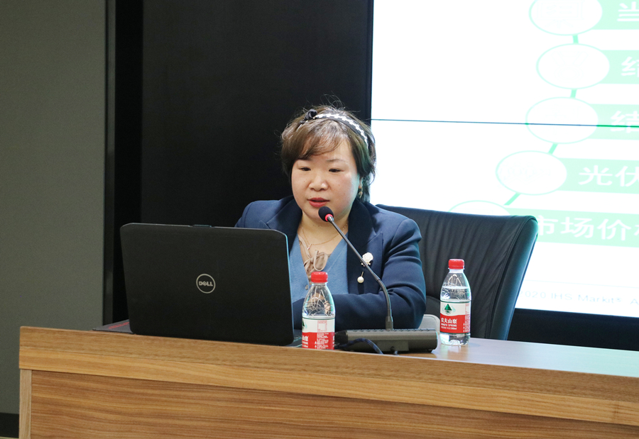 IHS Markit(埃信华迈)高级分析师胡丹为本次培训会主讲人。胡丹老师以“用清洁能源改变世界”为授课题目,针对光伏的起源、发展过程、近几年国家政策以及当前光伏投资形式、光伏组件市场价格及工程承包价格等内容展开了讲解,并结合两会精神和“碳达峰、碳中和”指标,为培训人员阐述了未来光伏发展趋势,希望大家精准把握政策导向,紧跟时代潮流,把握住光伏产业发展红利期。